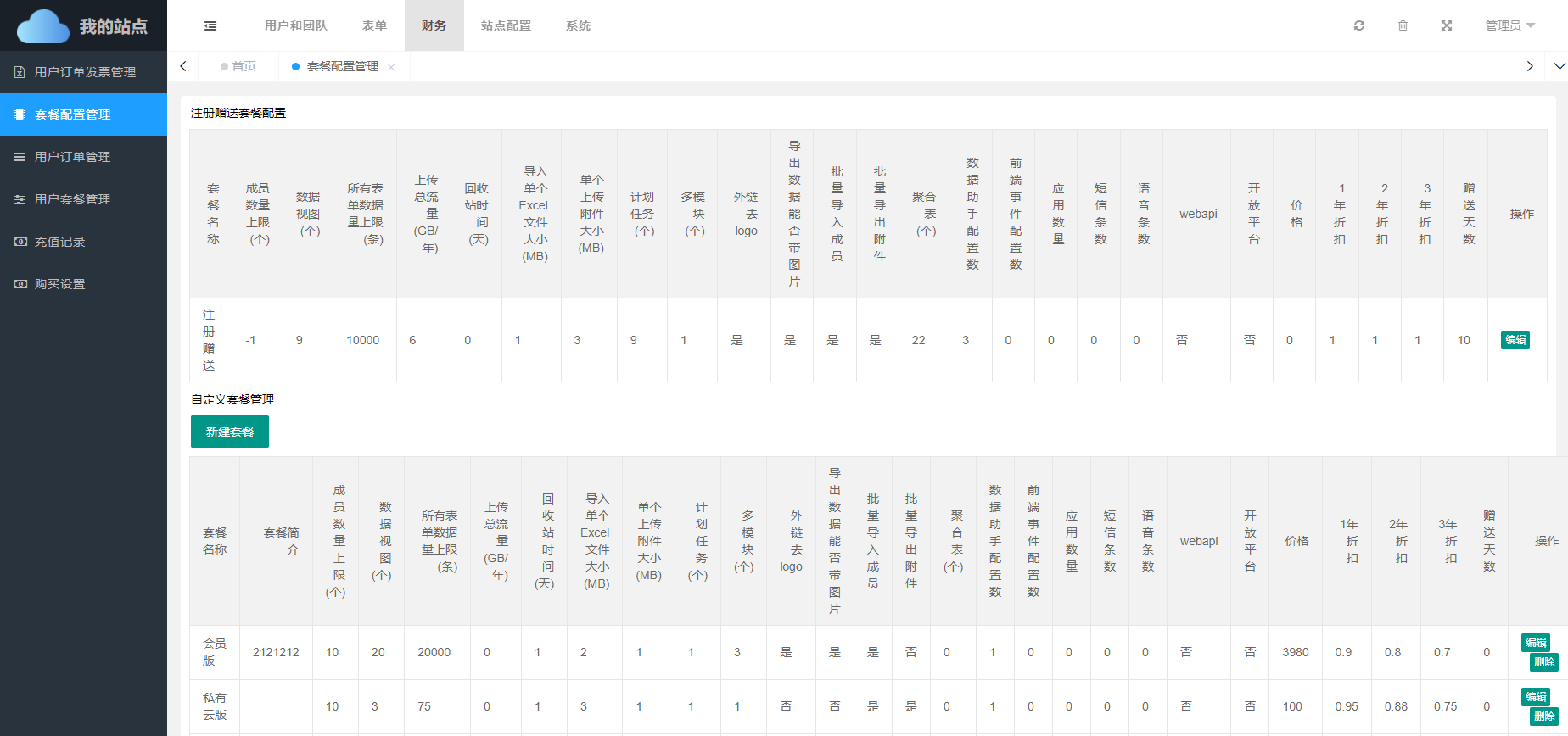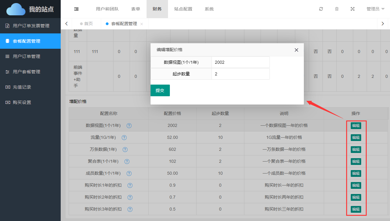 套餐名称可自定义修改,套餐的价格、各项配置数值均可自定义设置。