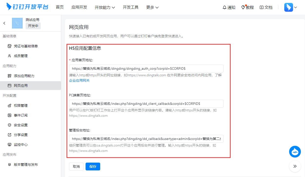 填写完应用凭证后添加网页应用能力,并将如下信息填写正确;