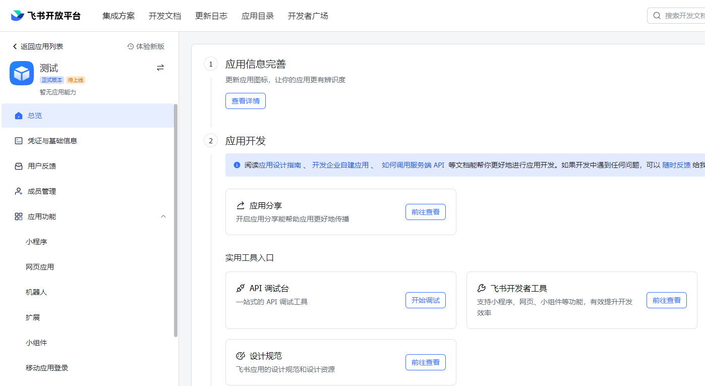 创建应用后,会自动跳转到应用详情页面,可以进行应用编辑。