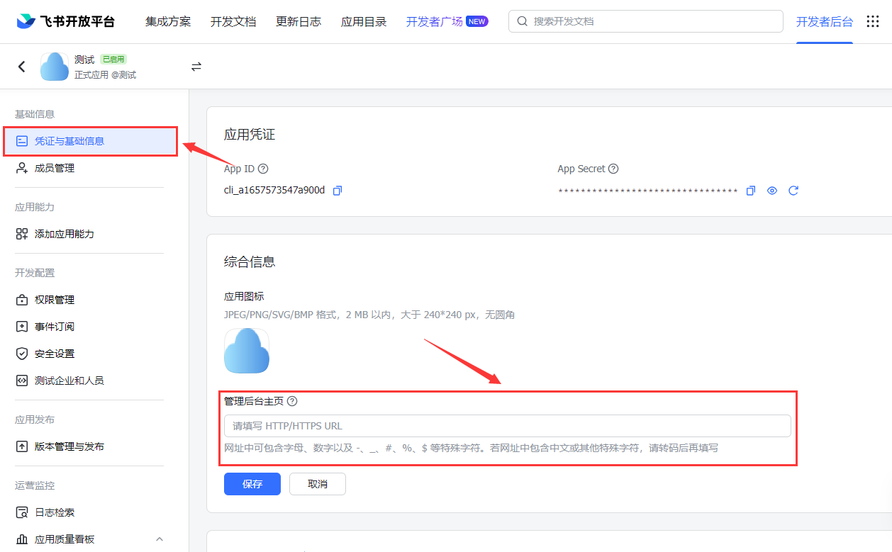 在凭证与基础信息中正确填写管理后台主页