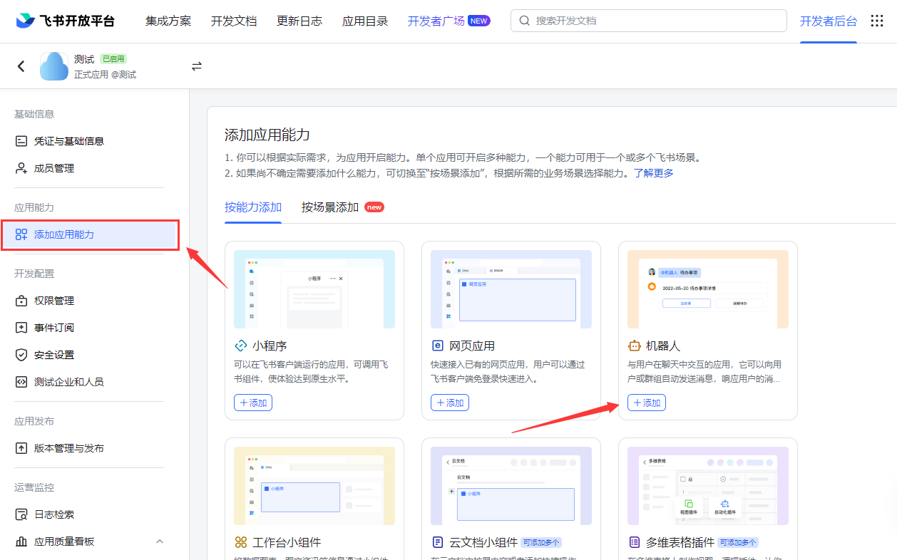 在添加能力分类下,添加机器人