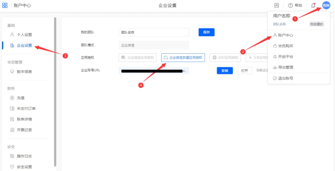 2、进入账户中心->企业设置选择企业微信自建应用授权。