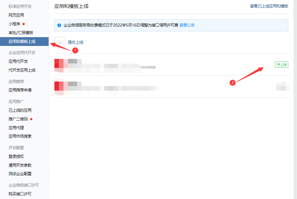 进入【应用管理】->【应用和模板上线】,点击提交上线按钮,耐心等待审核。 提交成功后,等待企业微信审核(约1~2天)。