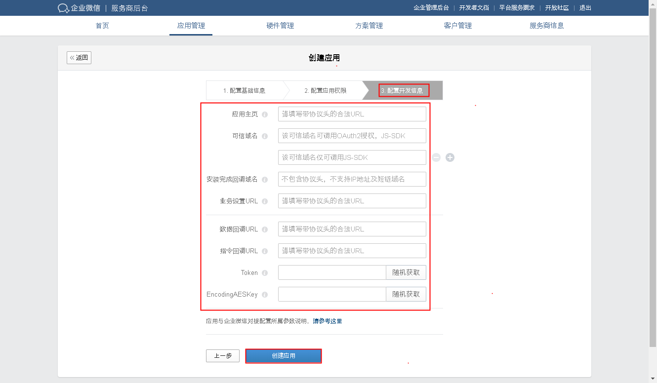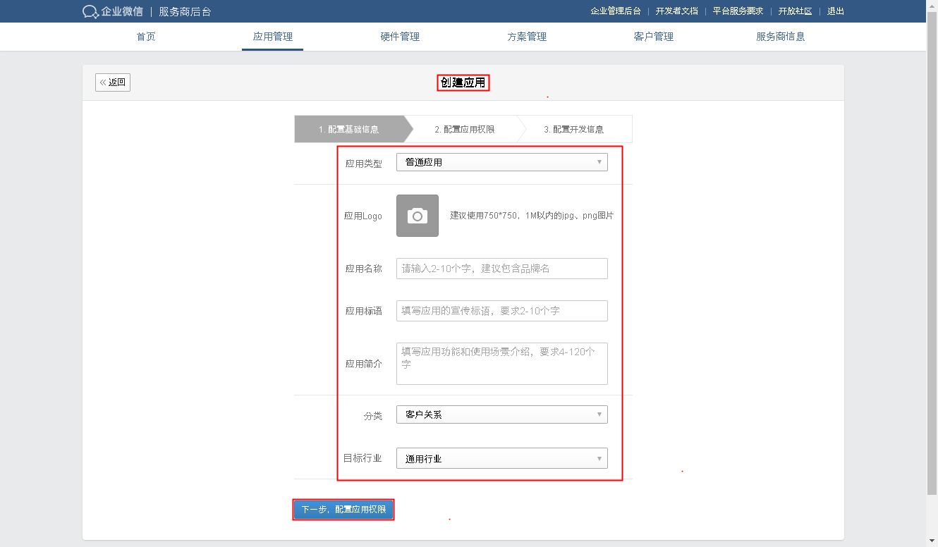 填写应用的基本信息、应用权限和配置开发信息