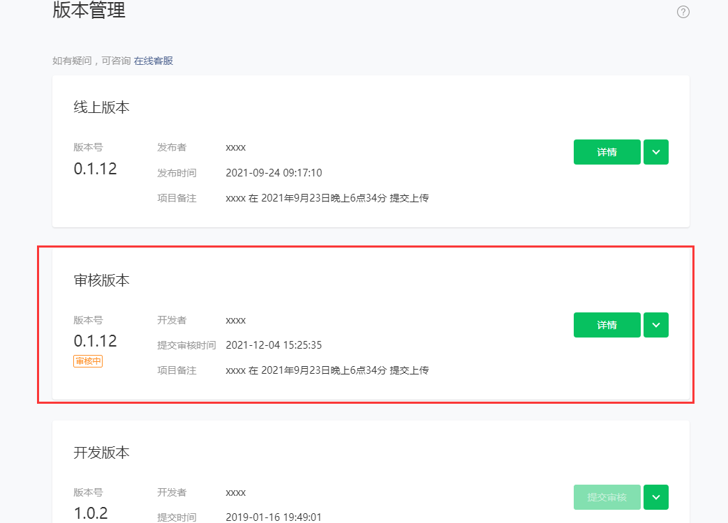 版本描述可随意填写,如:初版发布测试备注请填写下方内容:小程序为办公场景需求,属于特殊场景,需登录才能使用功能,使用用户皆为公司已使用产品的用户,已了解和使用产品具体功能,通过小程序快速登录使用。测试账号: 132xxxx1234 密码:xxxxxx