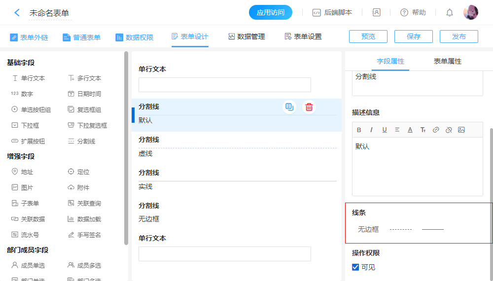 指分割线的线条,提供3种线条供选择:无边框、虚线、实线。