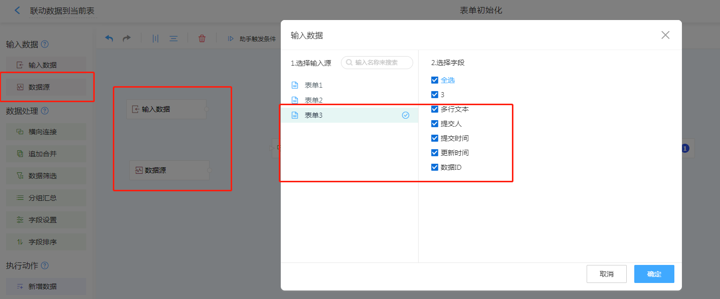 1. 输入数据选择输入数据与数据源(选择表单3)。
