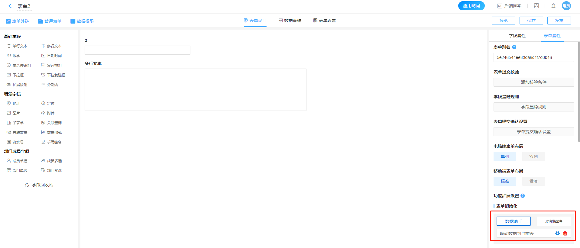 1. 进入表单2的表单属性的表单初始化数据助手配置页面。