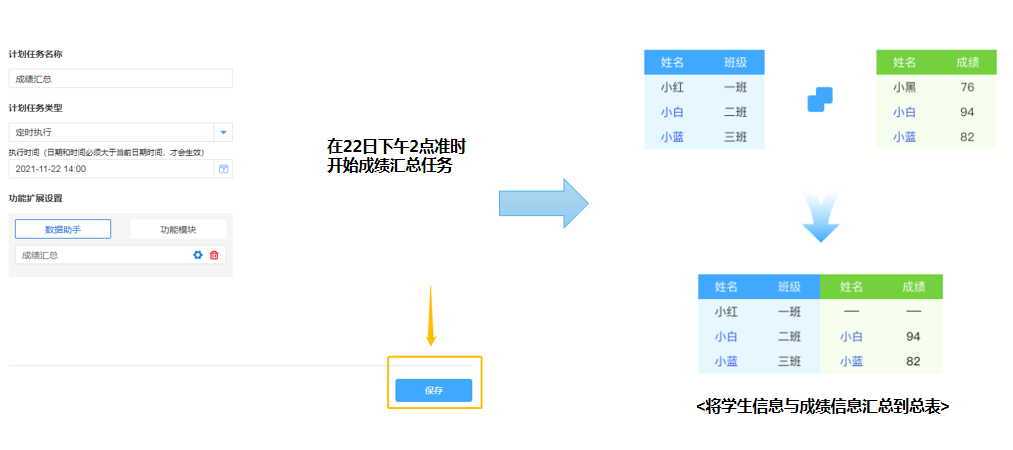 以家校管理中的学生成绩汇总为例,学生每个学期不同类型考试的成绩汇总,需要操作大量的数据表单,在易用云通过计划任务功能配合数据助手,能够有效为老师减负。