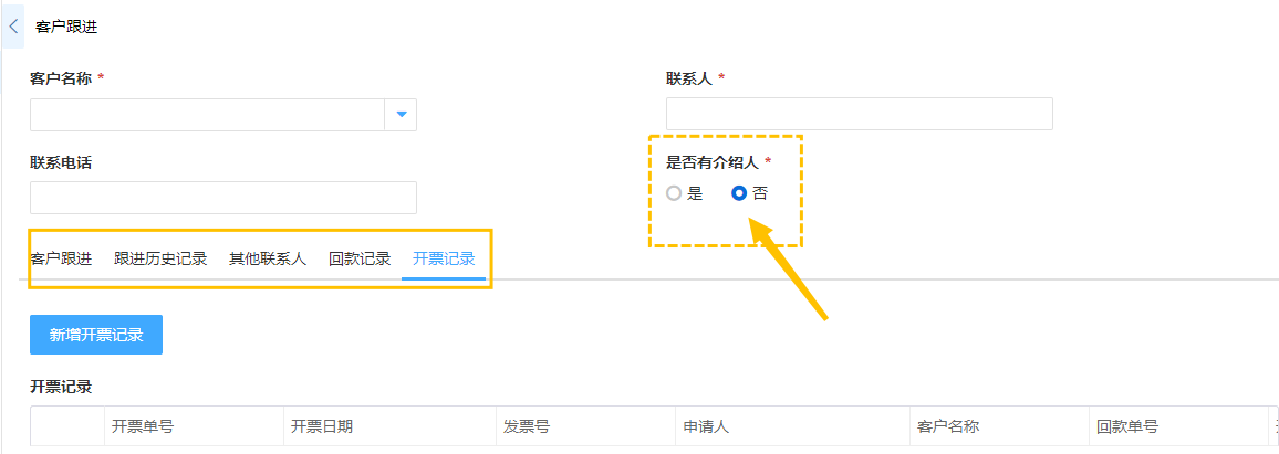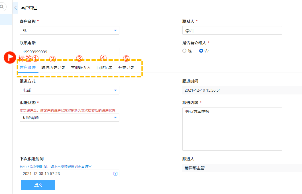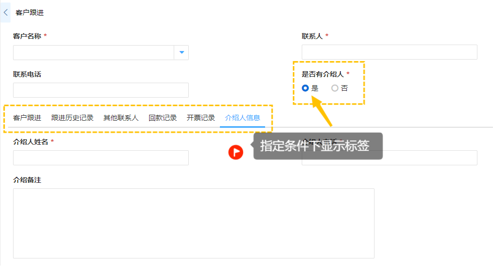 例如:客户跟进表单当中,除了录入客户基础信息,还需要记录其他联系人、回款记录、开票记录等等,使用多标签功能来进行处理,录入时分类清晰、明确;在查看相关数据时也可以采用多标签显示,每个分页添加一个关联查询,分类查看该客户的信息。