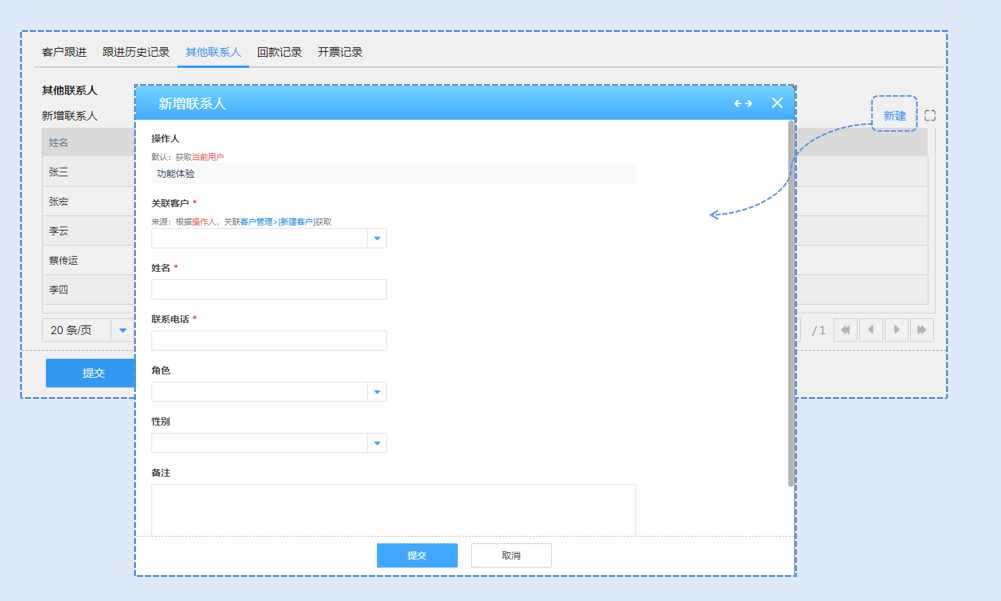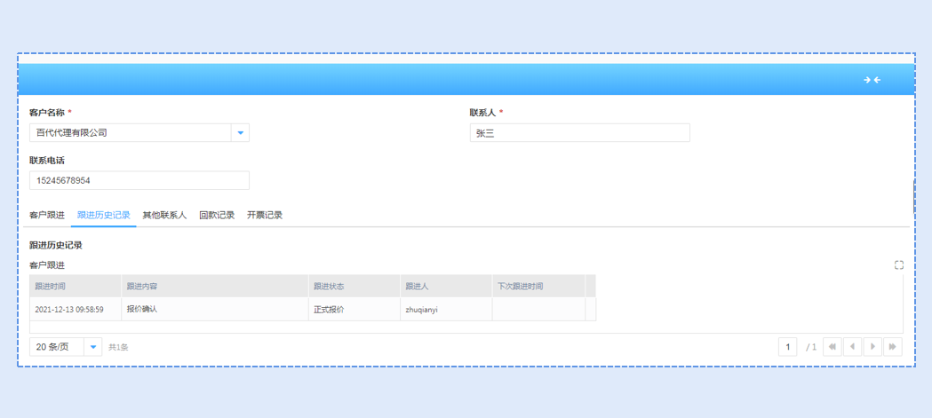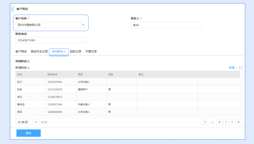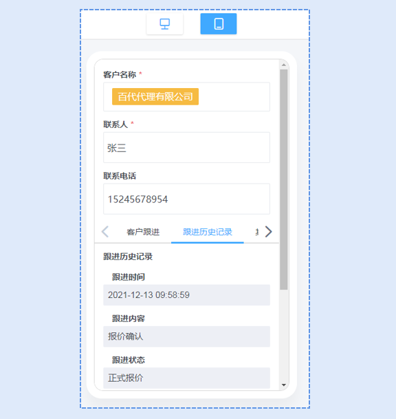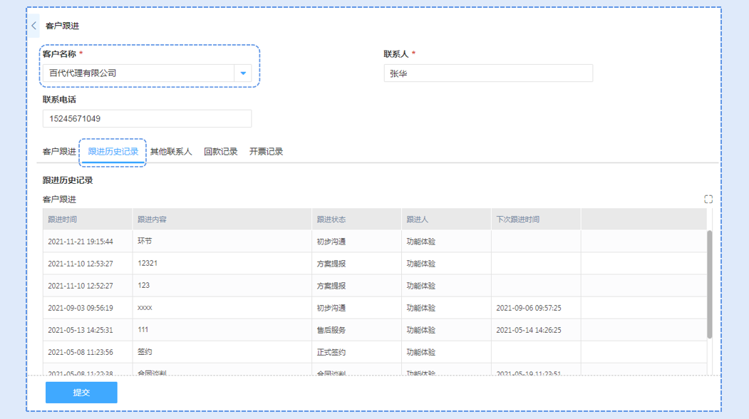 在客户关系管理系统中,客户跟进表单的记录,一般包含客户名称、联系人、联系电话、跟进方式、跟进状态等基本信息。当对接的客户数量多以及客户接触的时间较长时,很多节点进展业务人员不一定能完全知晓。