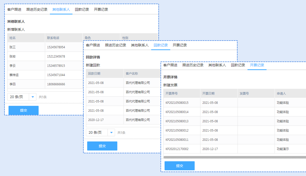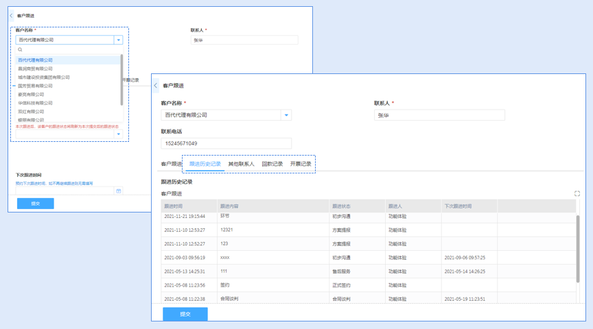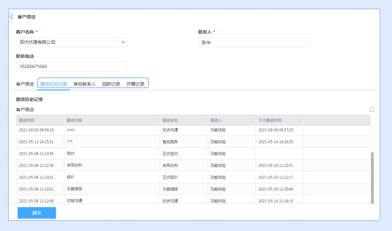 所有的设置编辑好保存后,我们就能方便地查询客户的历史跟进情况、与之相关的联系人、回款记录、开票记录等等。我们任意选择一家公司,与之相关的信息就能以列表的形式自动呈现。