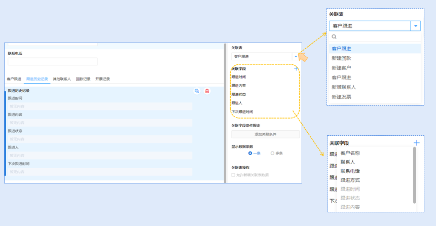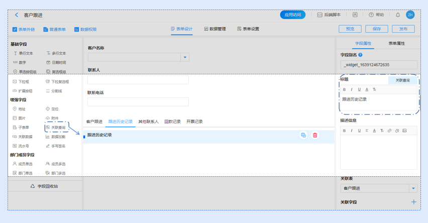选择跟进历史记录,在左侧的增强字段列表拖拽关联查询控件,在字段属性中修改字段标题后,下拉选择关联表以及设置关联字段。此处我们需要使用到客户跟进表单中的历史记录,并勾选需要的字段,完成关联。