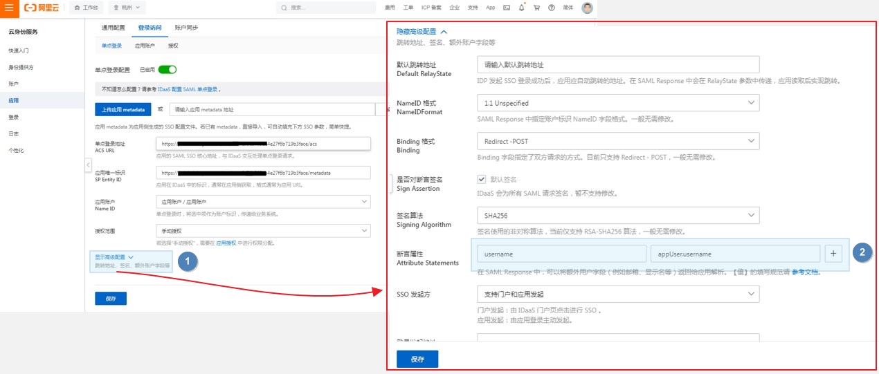 返回到阿里云 SAML应用配置页面,按照如下所示进行配置,部分配置内容需要复制平台中单点登录信息。