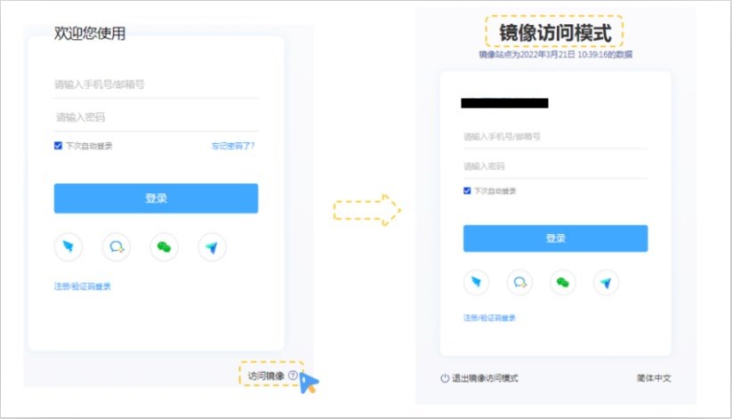 在登录页面可选择镜像访问模式进行登录,帮助用户像乘坐时光机一样,回到过去的某个时间点,查看该时段内的系统数据情况,减少因误删数据带来的负面影响。