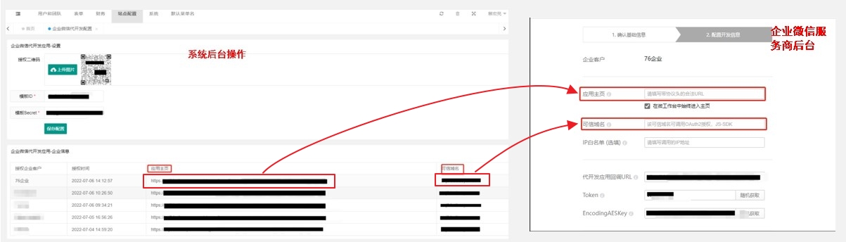 在企业信息中找到对应企业的 [ 应用主页] 和 [可信域名] 复制填写至企业微信。