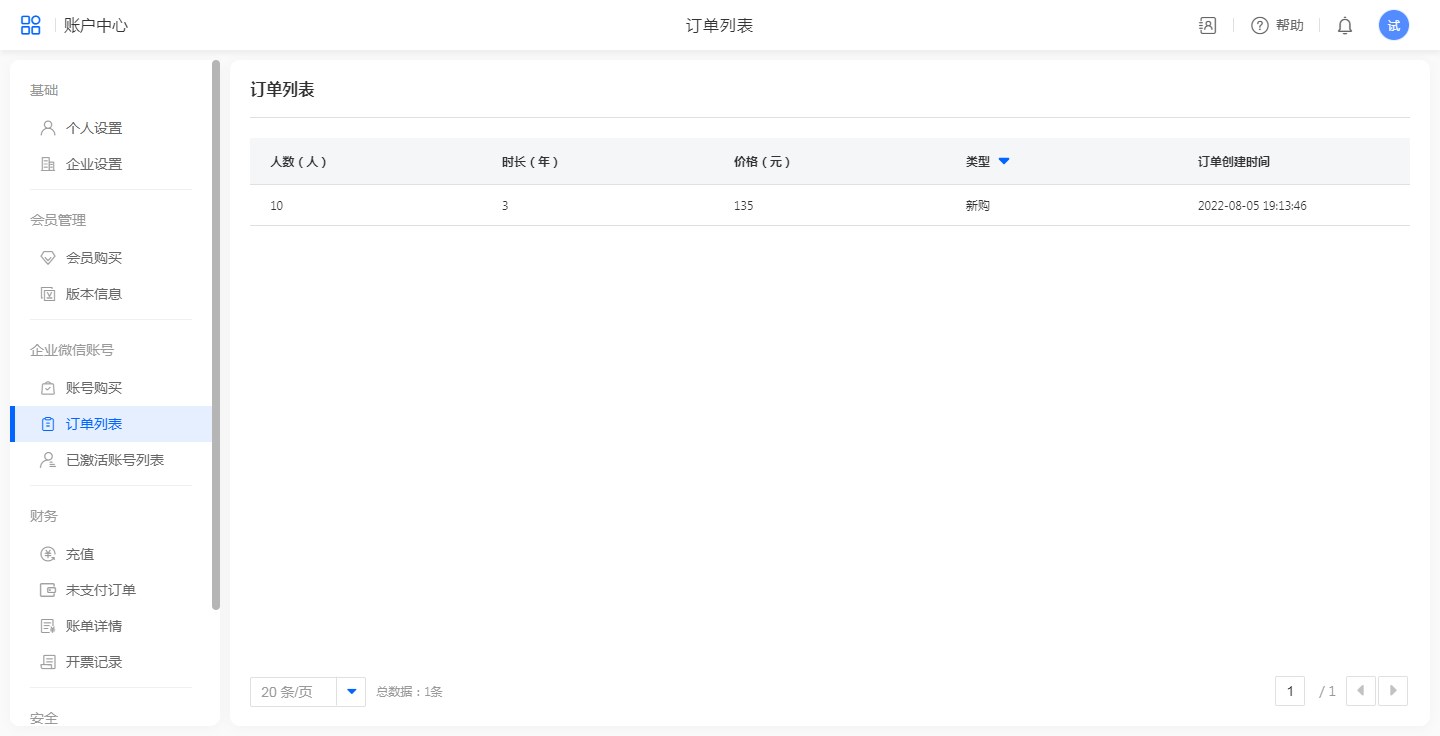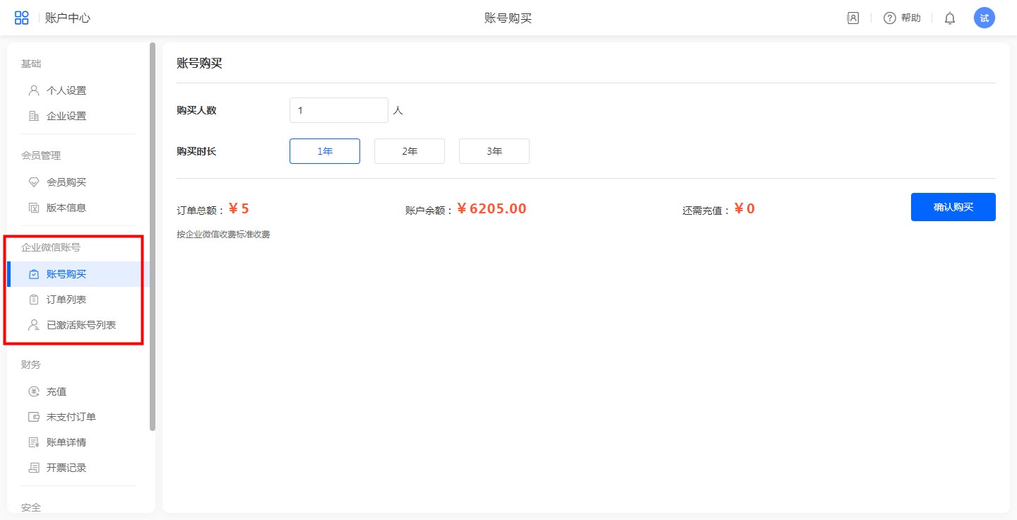 第一步:在[企业管理]->[企业微信账号]->[账号购买]下,输入数量和时长,确认购买。
