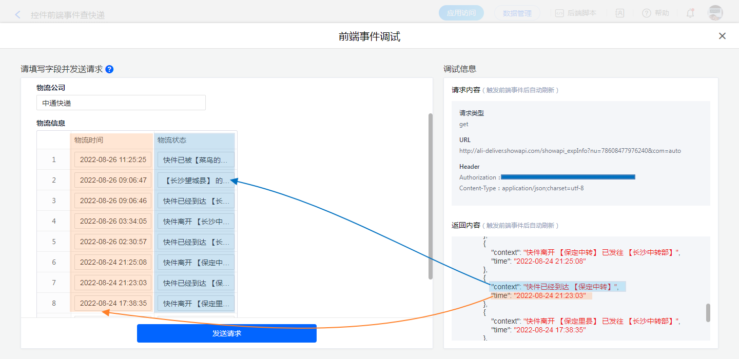 如查询快递的接口,将接口返回数据中的context写入 物流信息.物流状态中,time写入物流信息.物流时间
