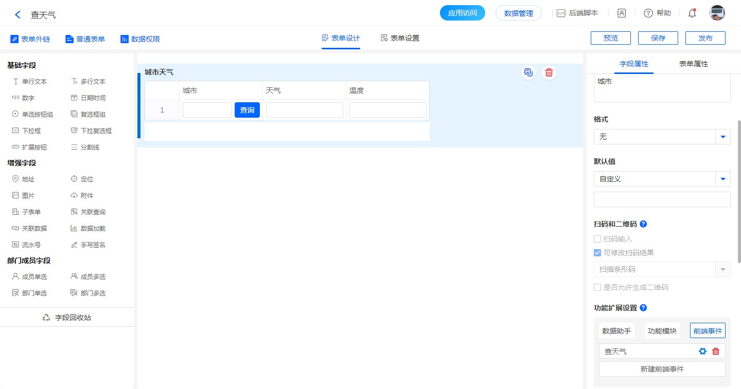 新建天气查询表单,设计字段: