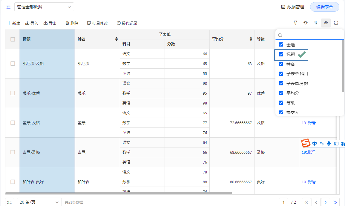 如下图,成绩表单的第一个字段是[姓名],则默认标题是[姓名]。
