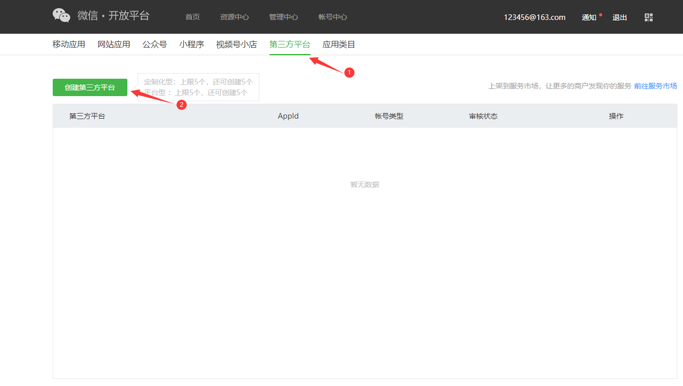 首先需要在微信开放平台登录后,进入管理中心->第三方平台->创建第三方平台