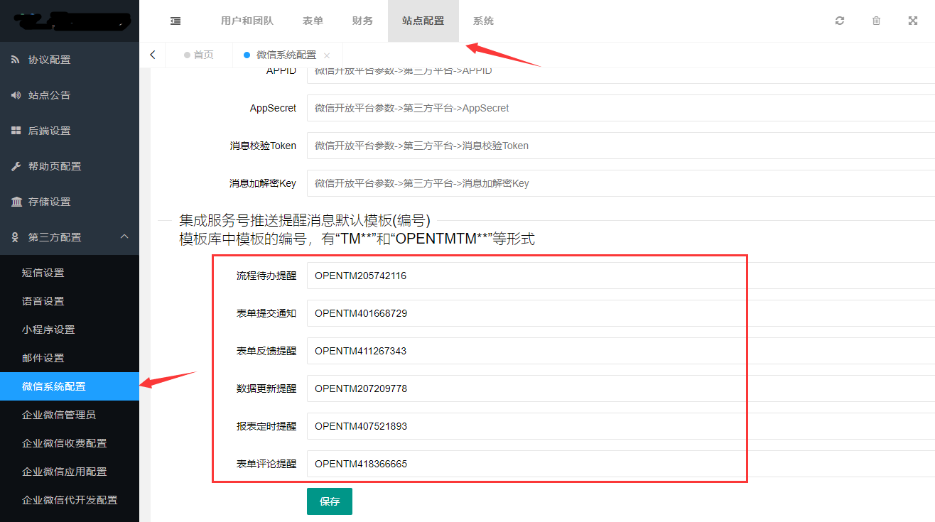 进入站点配置->第三方配置->微信系统配置,进行消息模板编号设置