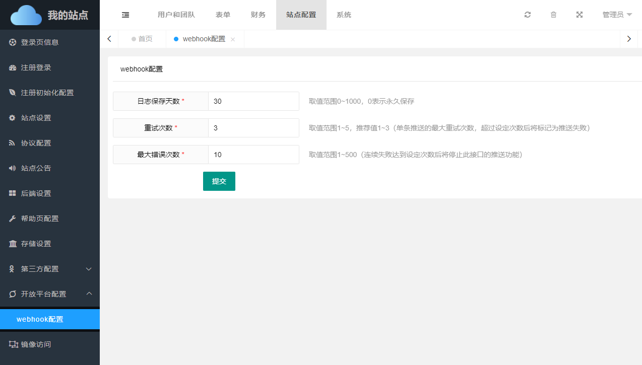 开放平台设置目前只有系统webhook功能的相关配置,Webhook是应用给其它应用提供实时信息的一种方式。