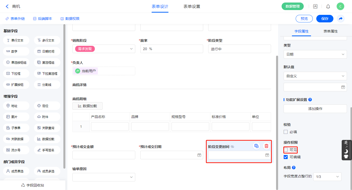 3)【阶段变更时间】字段设置为不可见;