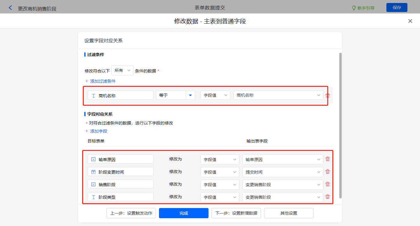 触发条件设置为当【变更销售阶段】字段等于【输单】,则修改主表【输单原因】、【销售阶段】、【阶段变更时间】、【阶段类型】四个字段的值;