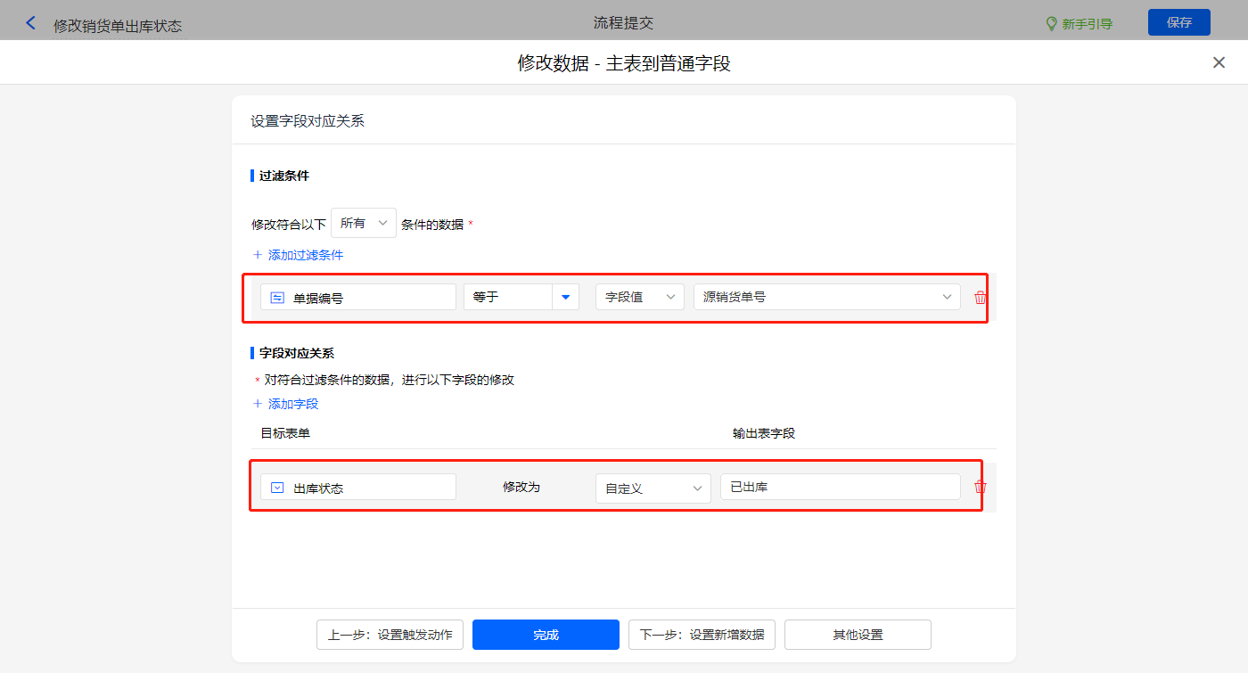 其他设置触发条件为【单据类型】字段等于销货,设置好点击【完成】并保存该数据助手;