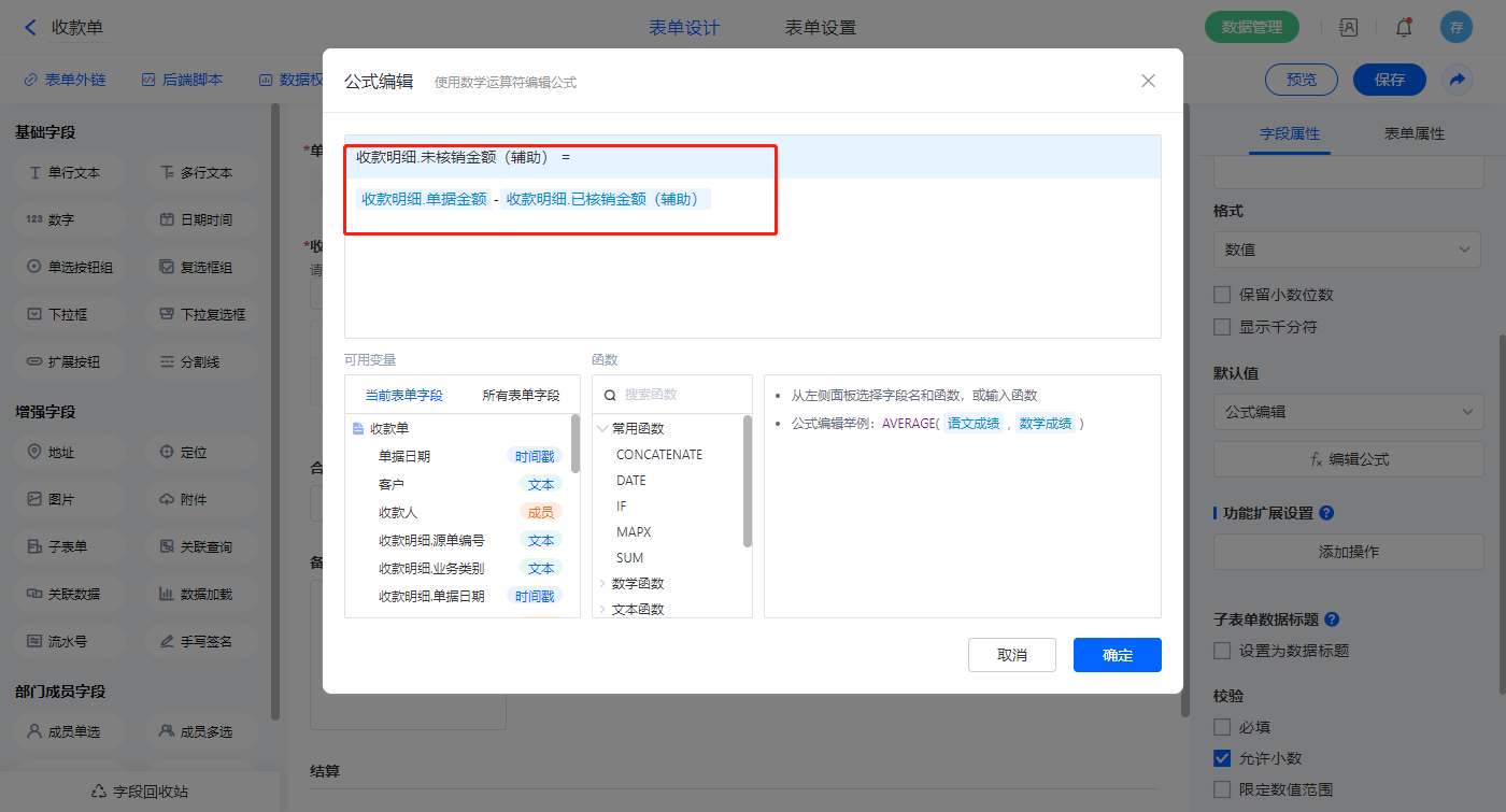 选择【收款明细.未核销金额(辅助)】字段,设置默认值为公式编辑,如图设置公式