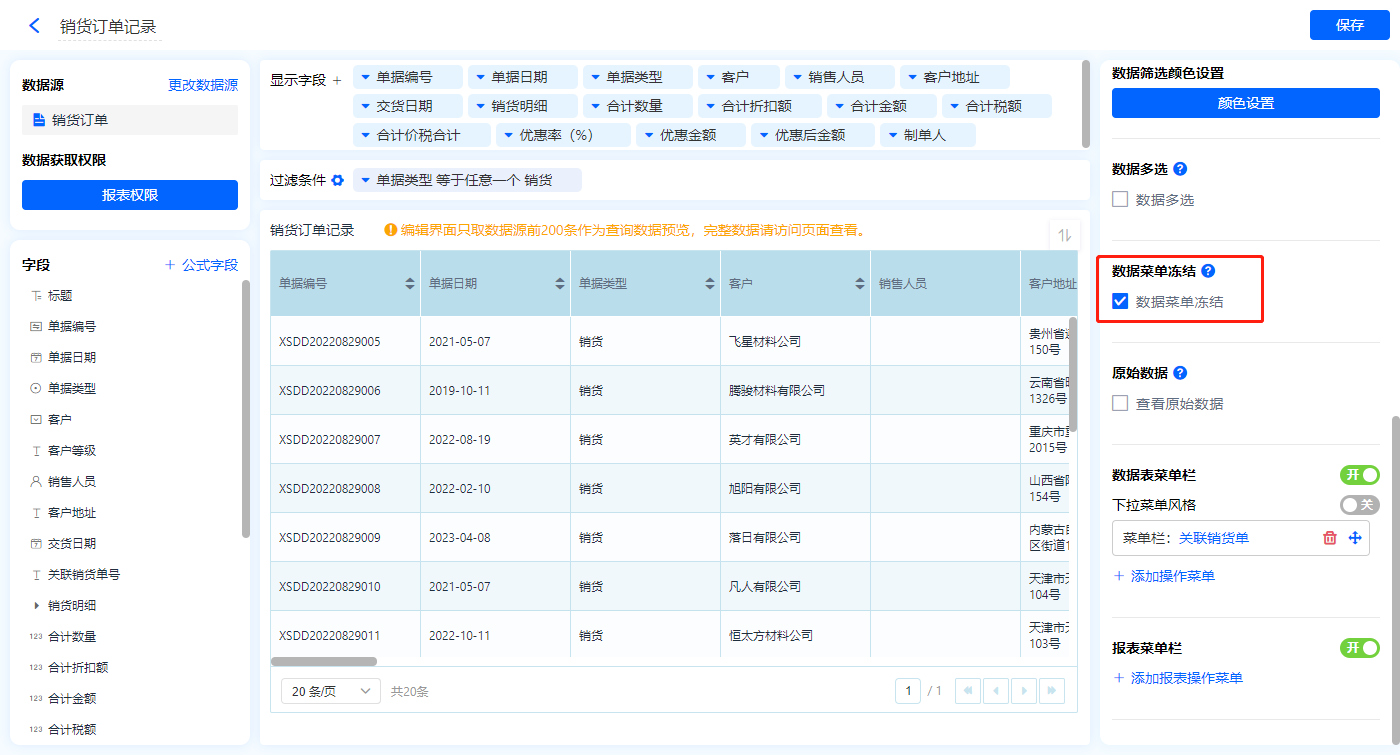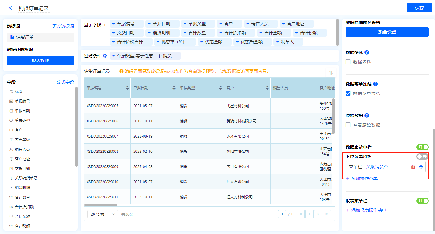 1)新增【历史销货单】报表,用基础报表【数据表】展示数据源为表单【销货单】的数据;