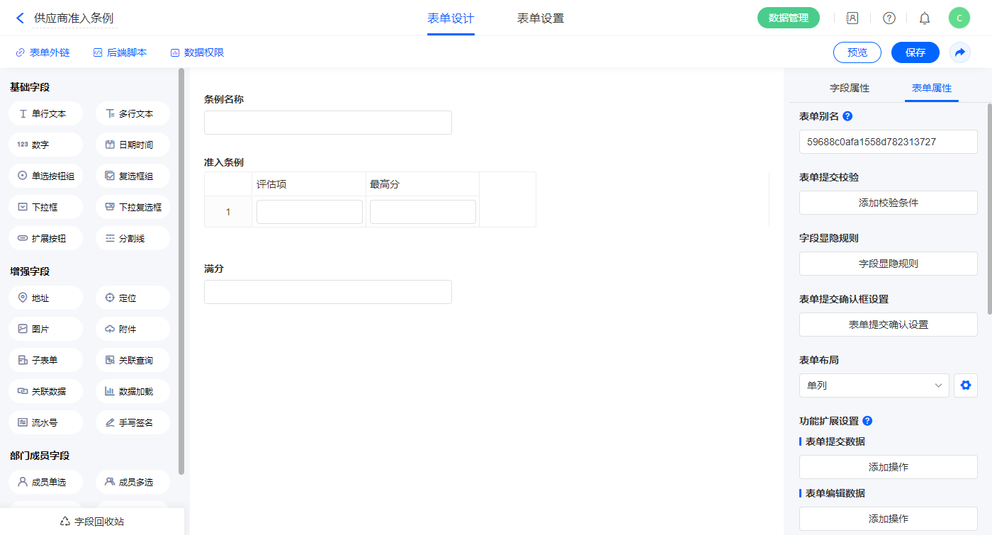 2.3、表单【供应商准入条例】字段及表单属性设置