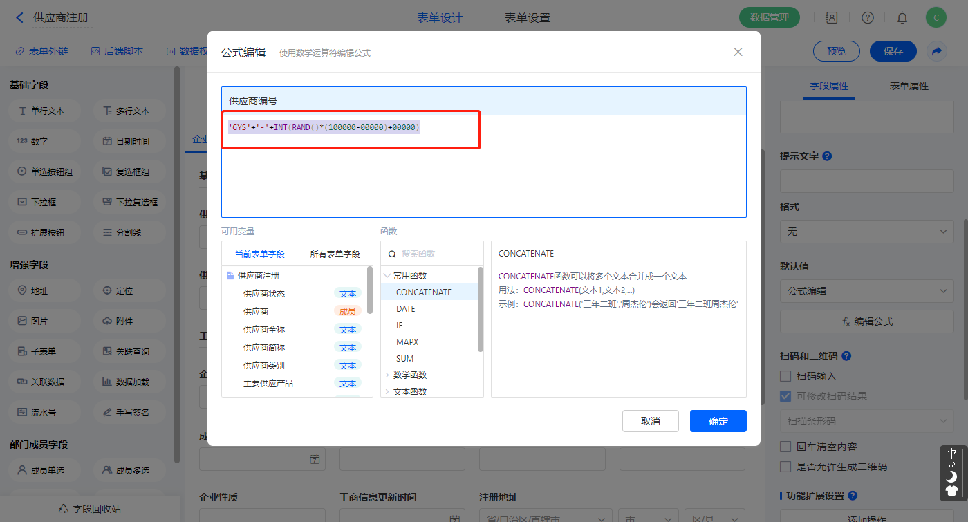 3)【供应商编号】字段设置默认值为公式编辑,设置公式:“'GYS'+'-'+INT(RAND()*(100000-00000)+00000)”;