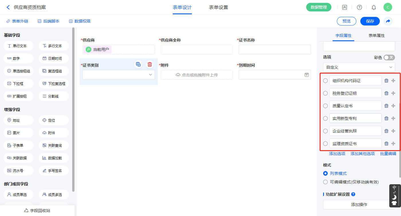 1)选中【等级】、【供应商状态】、【供应商类别】字段,输入下拉框选项;
