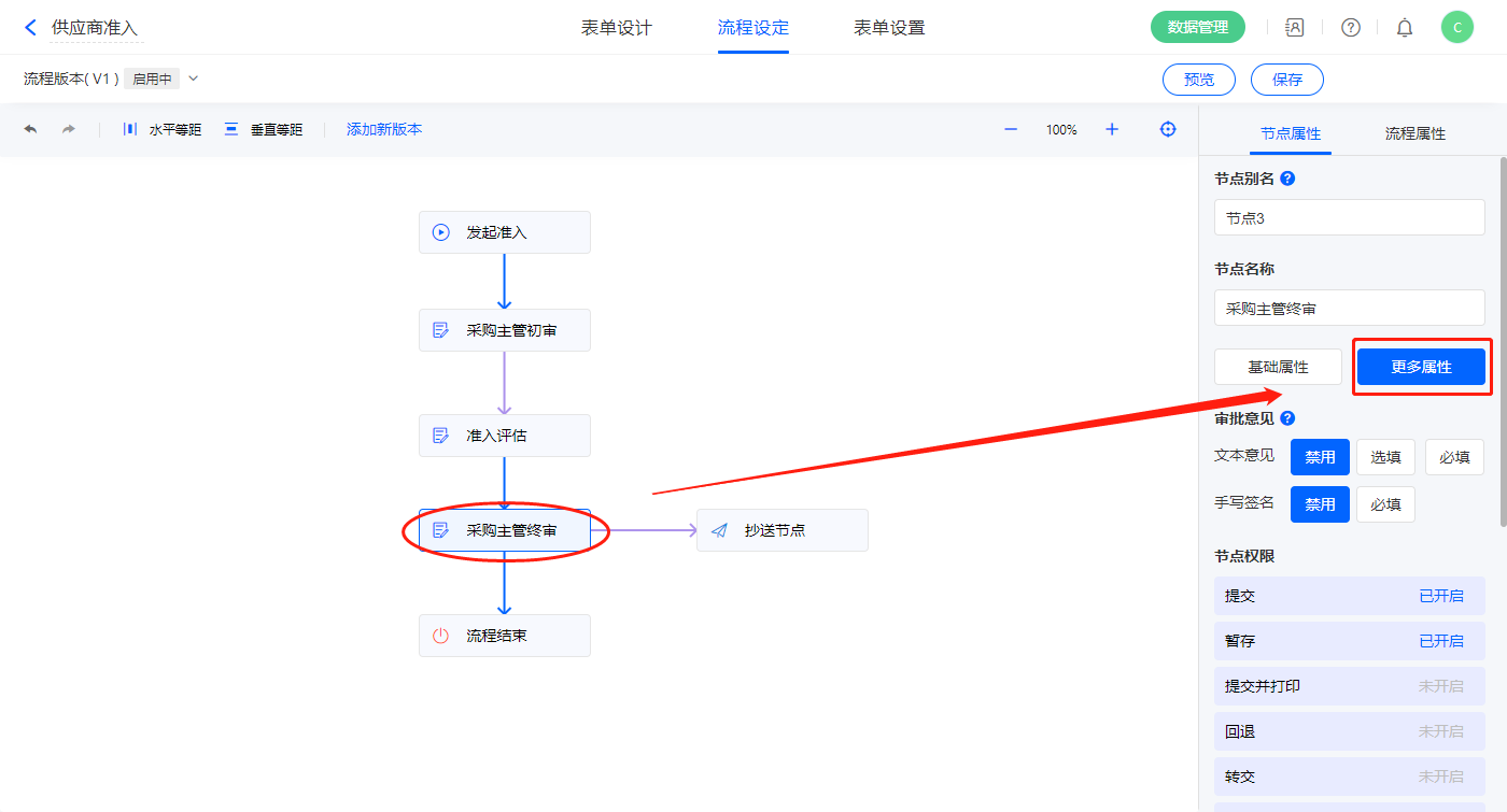 6)该表单是流程表单,设置流程节点,采购主管终审节点的节点权限提交设置一条数据助手;