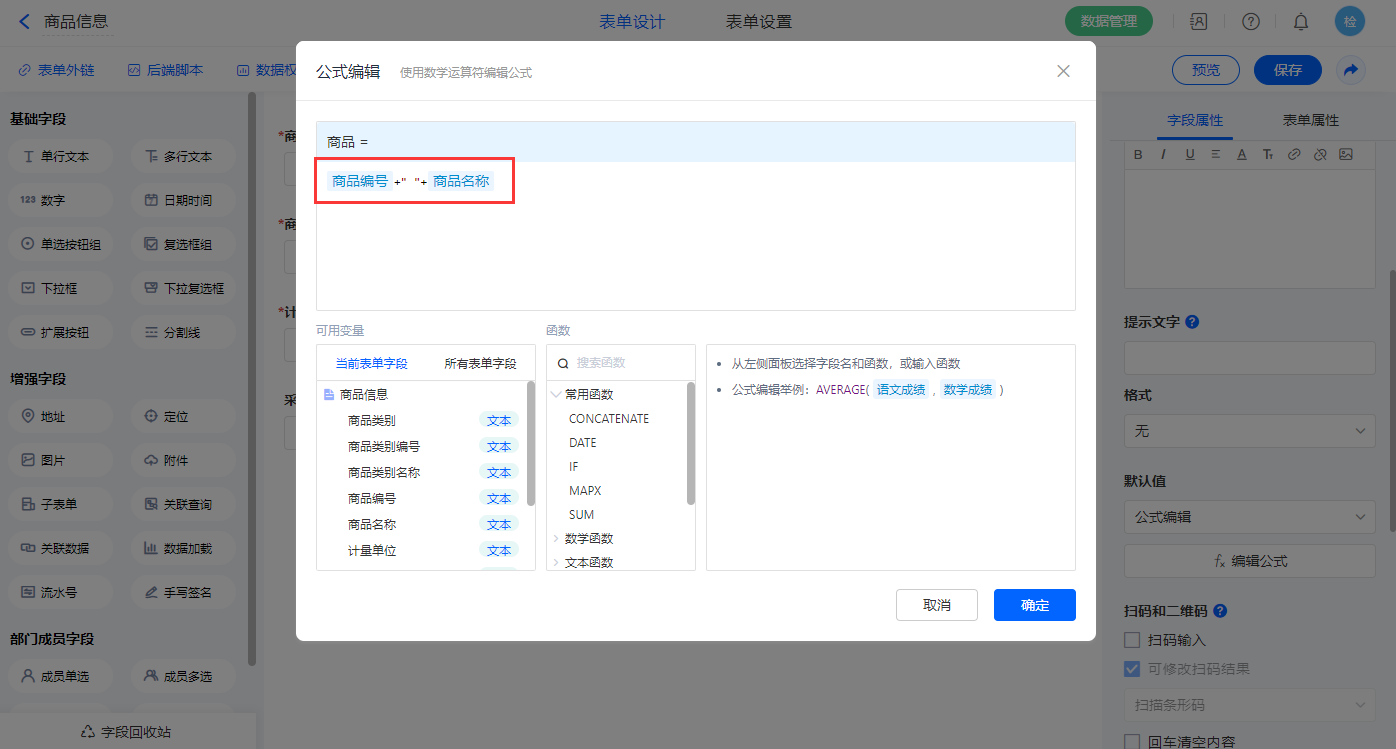 【商品】字段设置默认值为公式编辑,如图设置公式;
