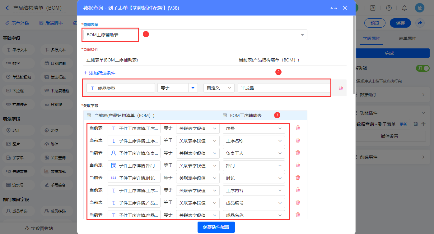 设置三个【数据查询 - 到子表单】功能插件,如图配置;第一个配置【子生产计划明细】子表单;