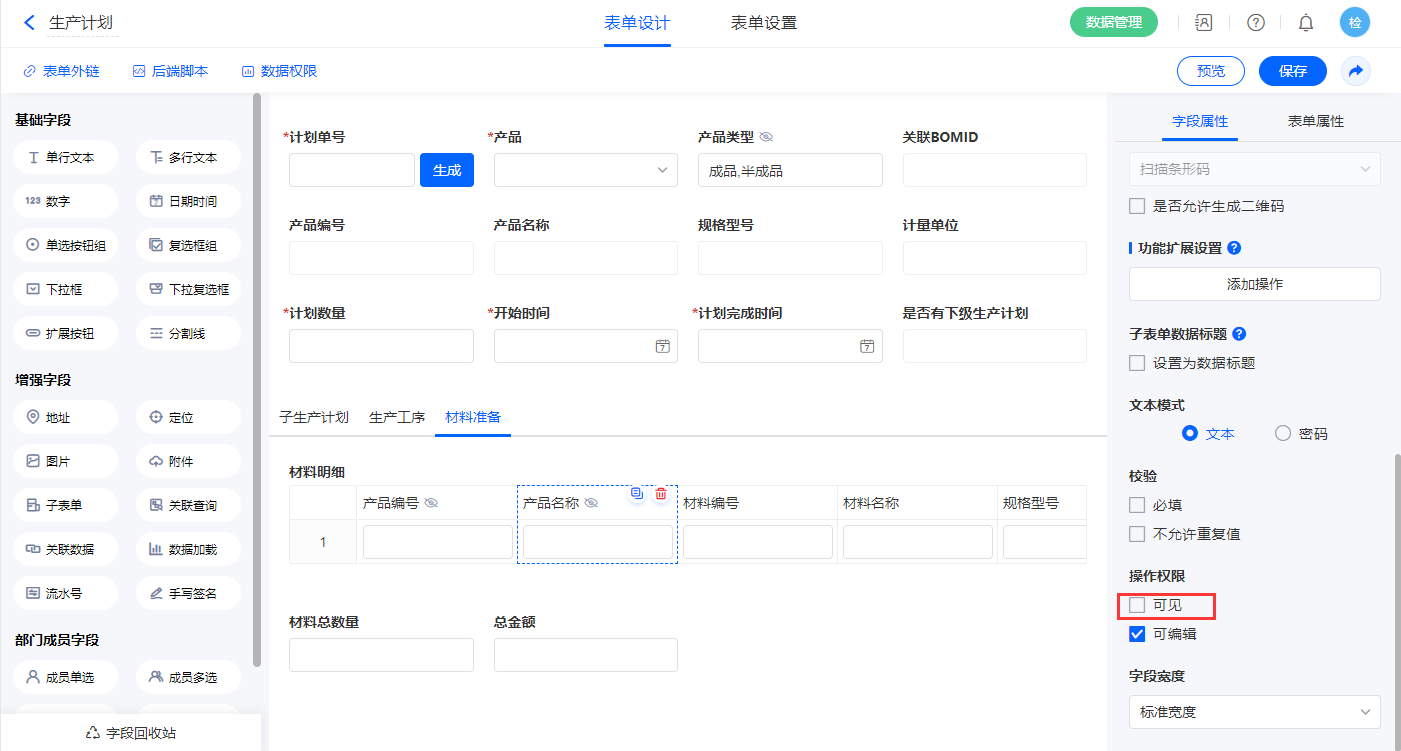 | 计划数量 | 数字 | 材料明细 | 子表单 |