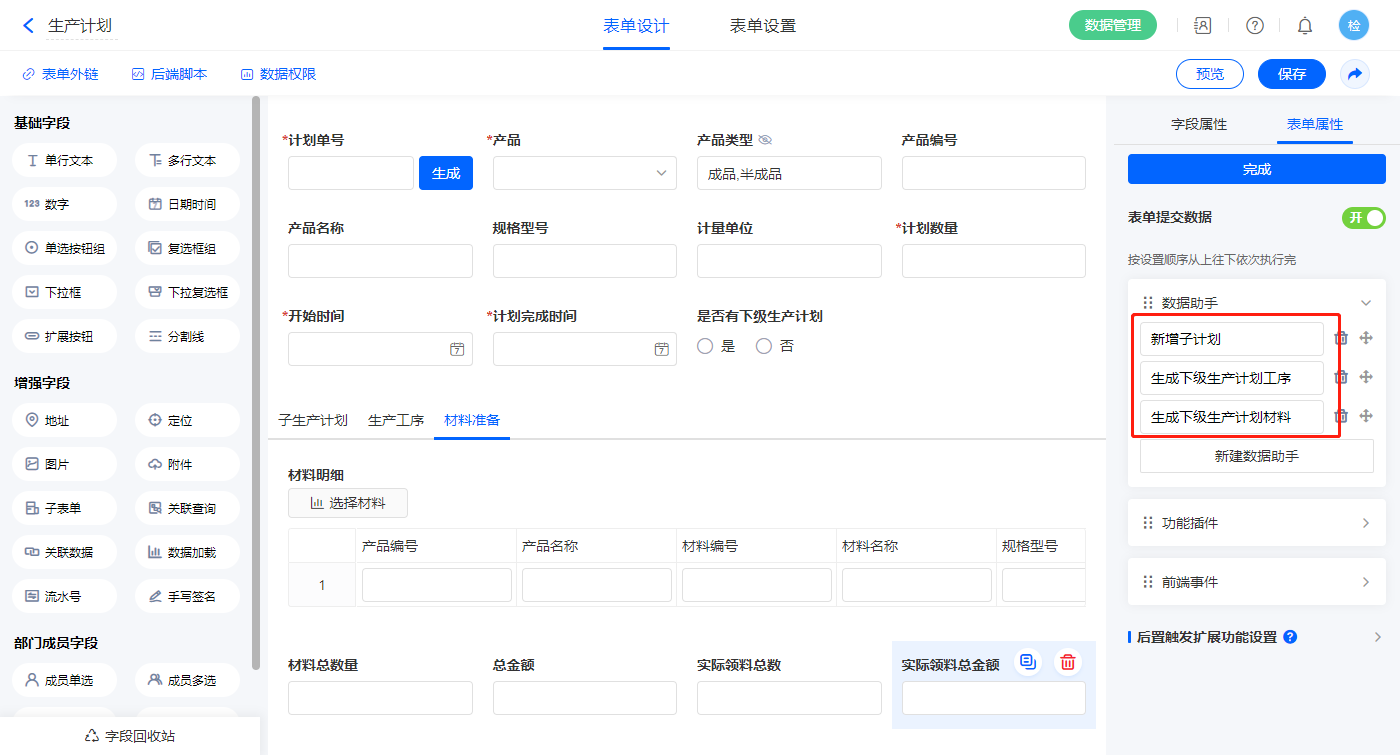 | 计划数量 | 数字 | 材料明细 | 子表单 |