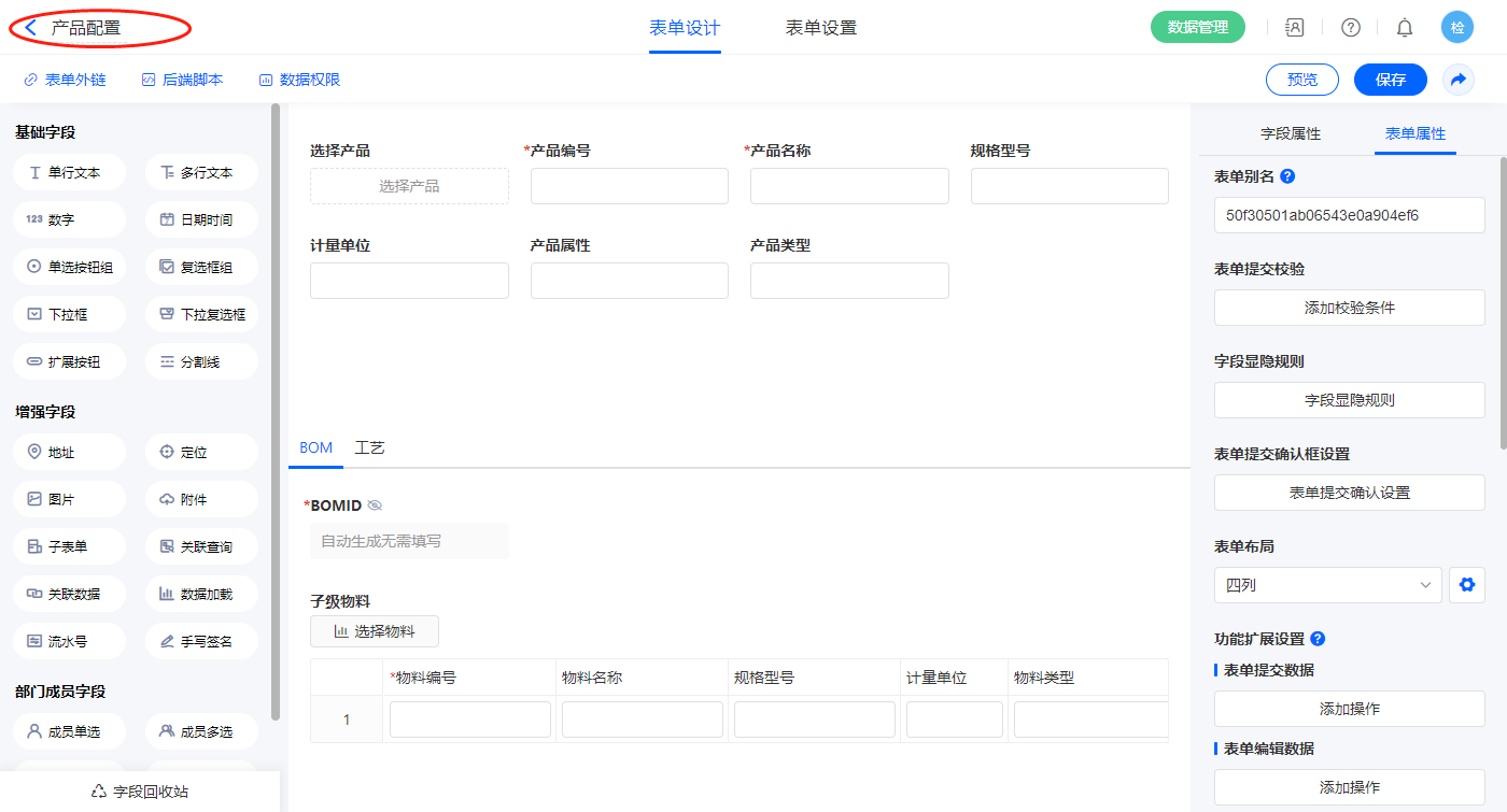 | 工艺路线名称 | 单行文本 | 工艺工序 | 子表单 |