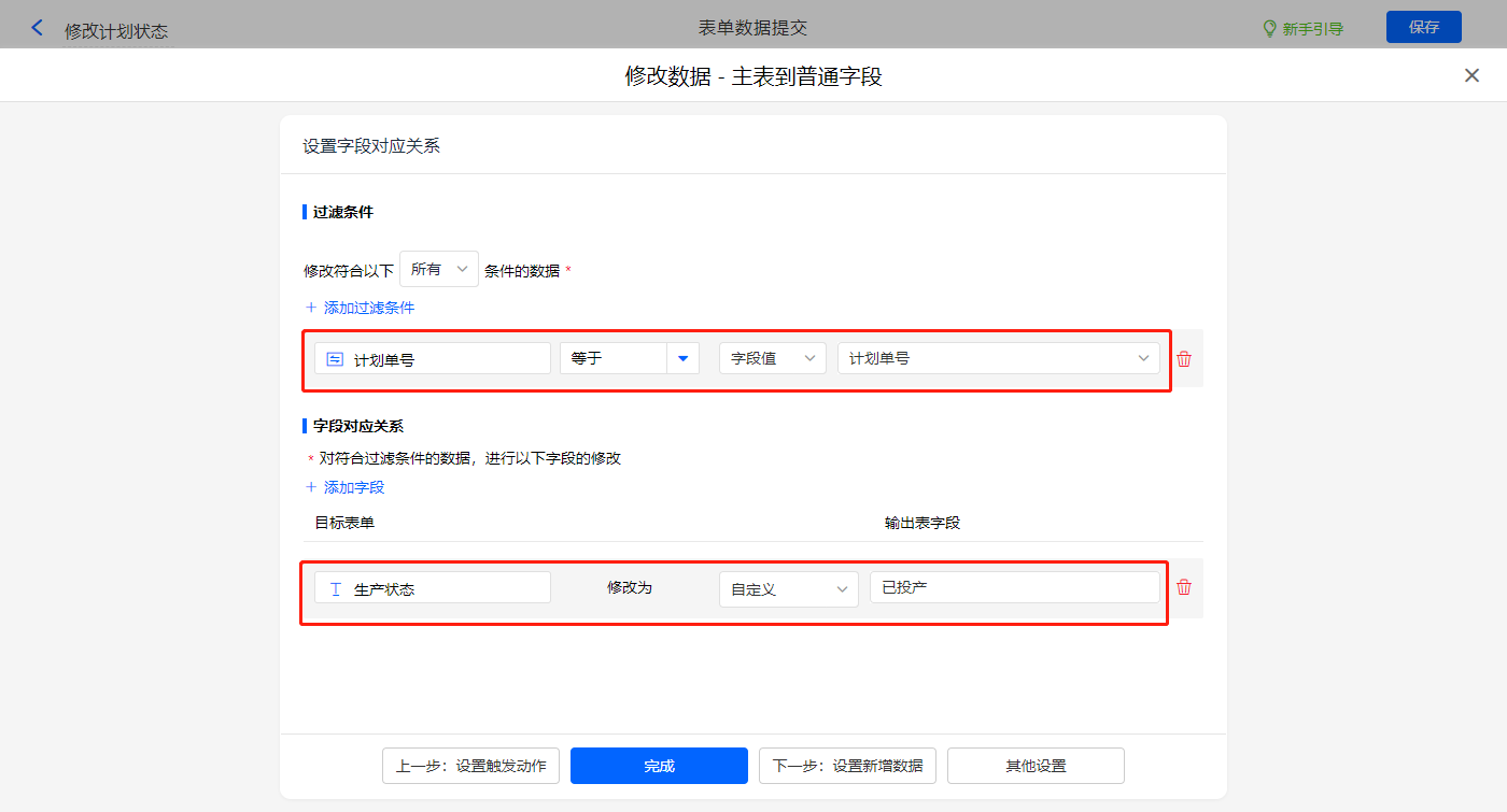 名称为修改生产计划状态,新增修改数据的执行动作,选择修改【生产计划】表单,选择对应过滤条件,以及需要修改的字段,设置好点击【完成】并保存该数据助手;