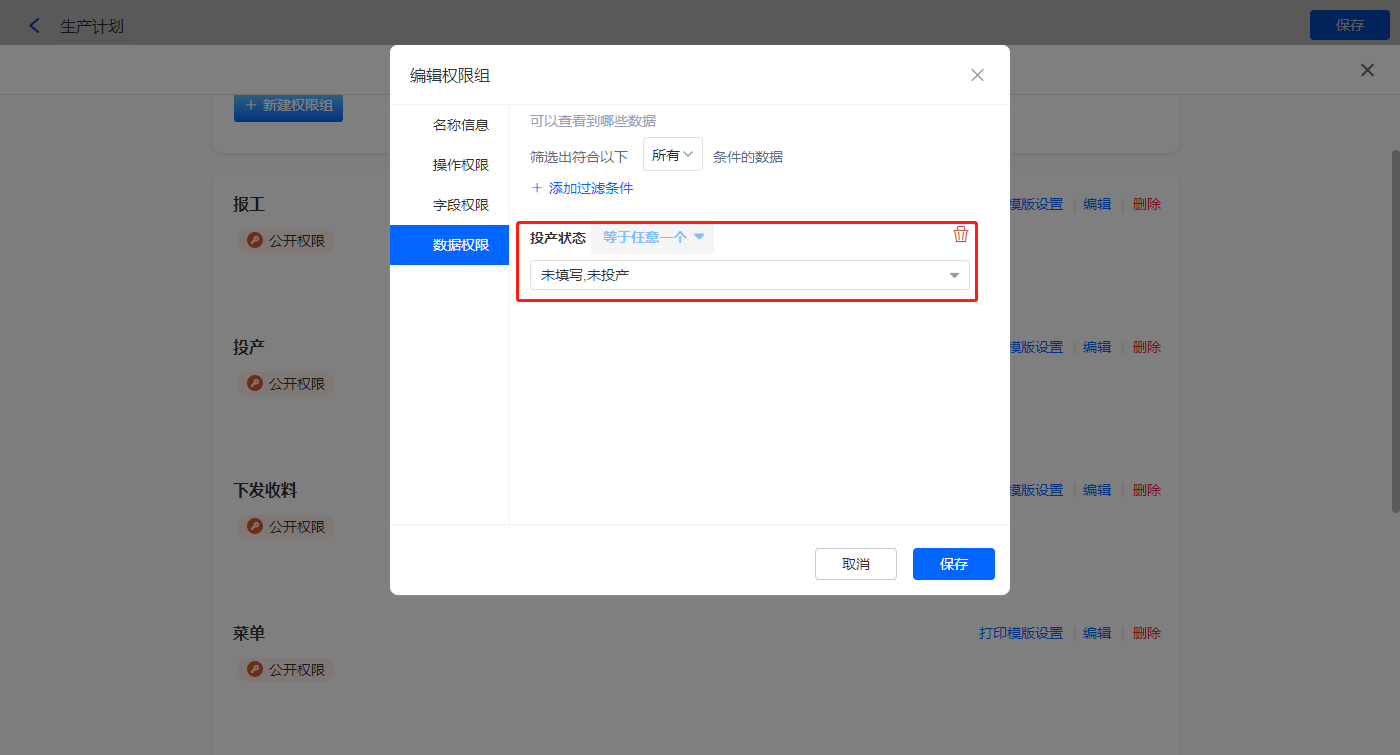 投产数据权限添加过滤条件,【投产状态】等于未填写,未投产;