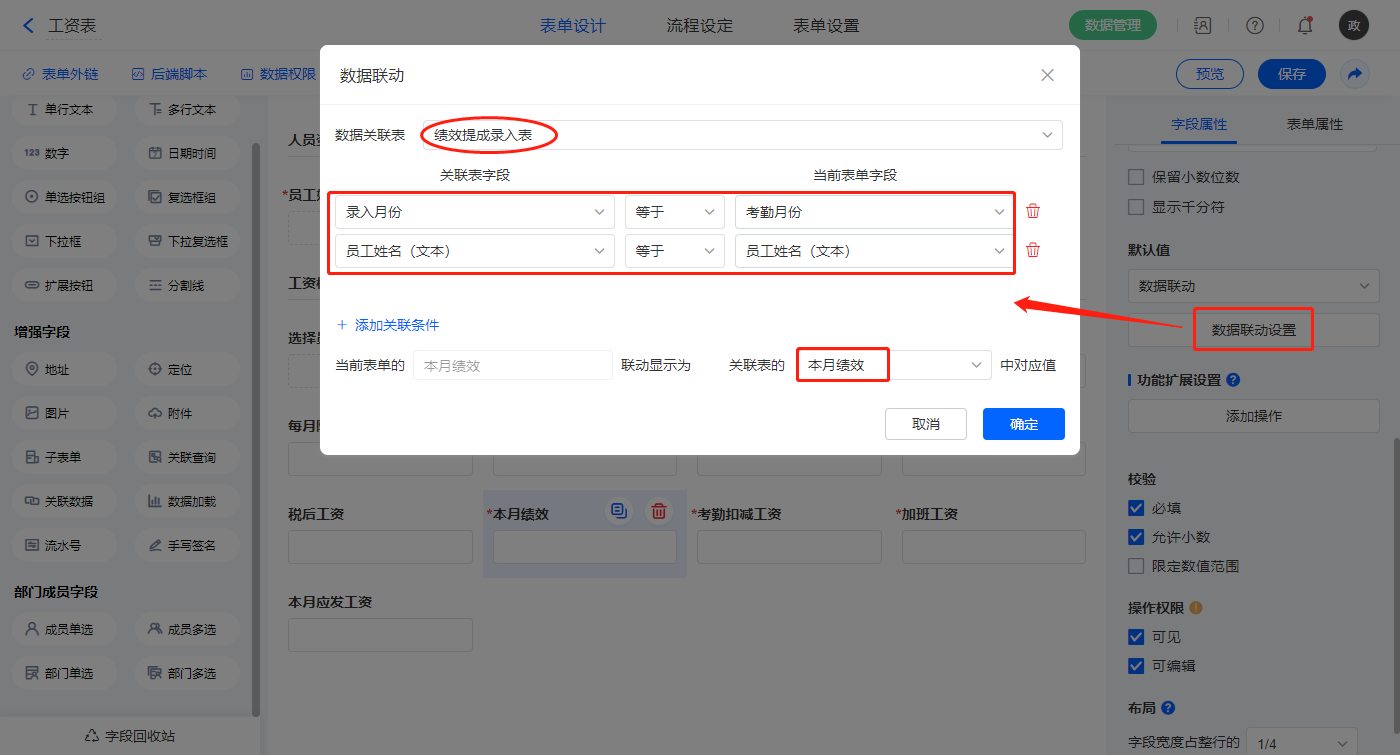 2)【本月绩效】字段,设置默认值为数据联动,设置联动条件及联动字段;