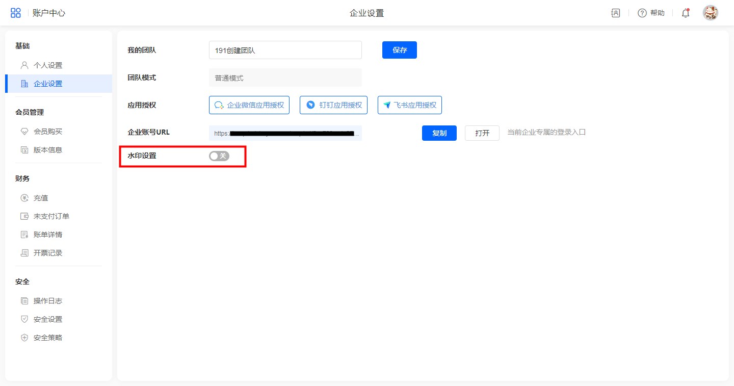 账户中心>>企业设置>>水印设置,开启水印设置。