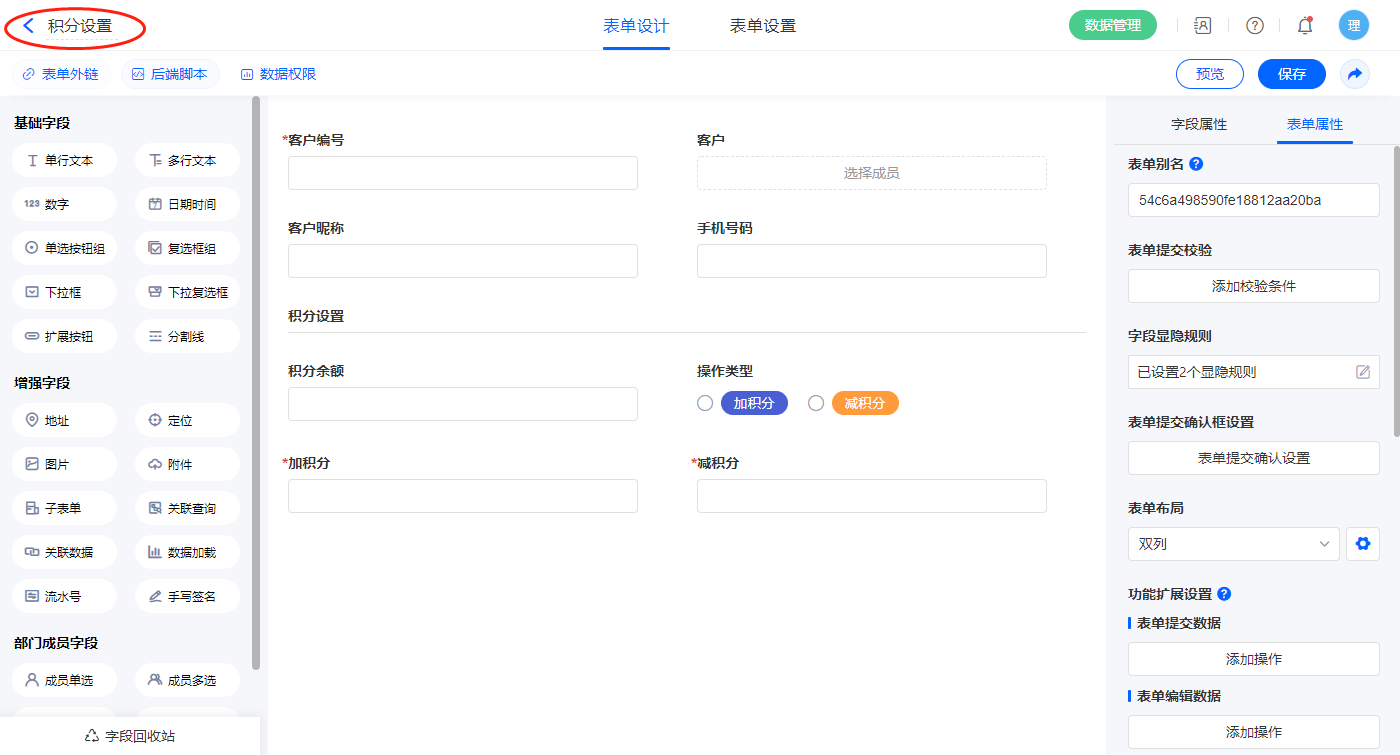 【加积分】的菜单栏,操作模式设置为弹出表单【积分设置】;