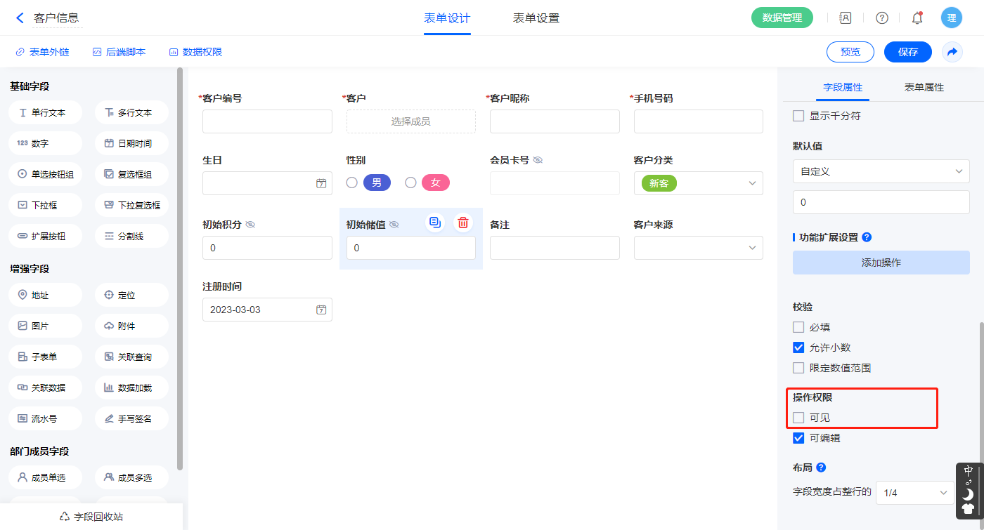 1)选中【会员卡号】、【初始积分】、【初始储值】字段,设置不可见;
