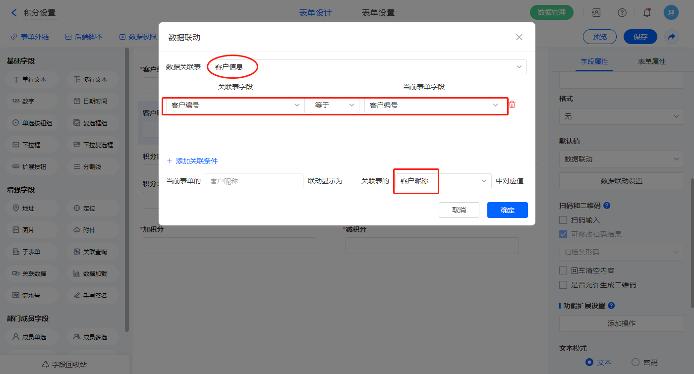 【客户昵称】字段,设置默认值为数据联动,设置联动条件及联动字段;