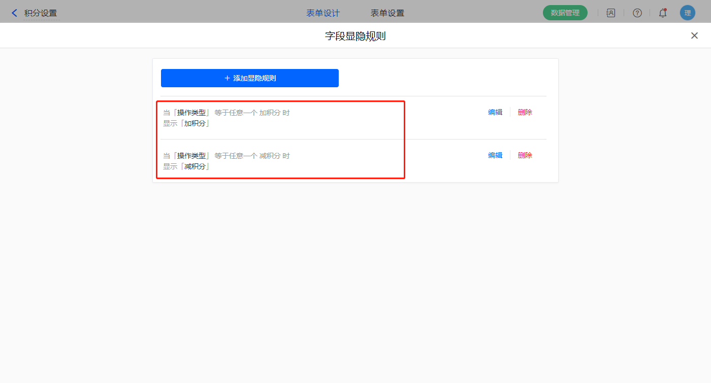 2)设置两条显隐规则,当【操作类型】字段等于加积分显示【加积分】字段,当【操作类型】字段等于减积分显示【减积分】字段;