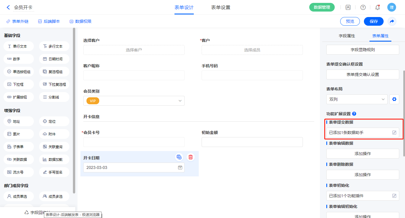 2)表单提交设置一条数据助手,名称为修改会员卡信息;